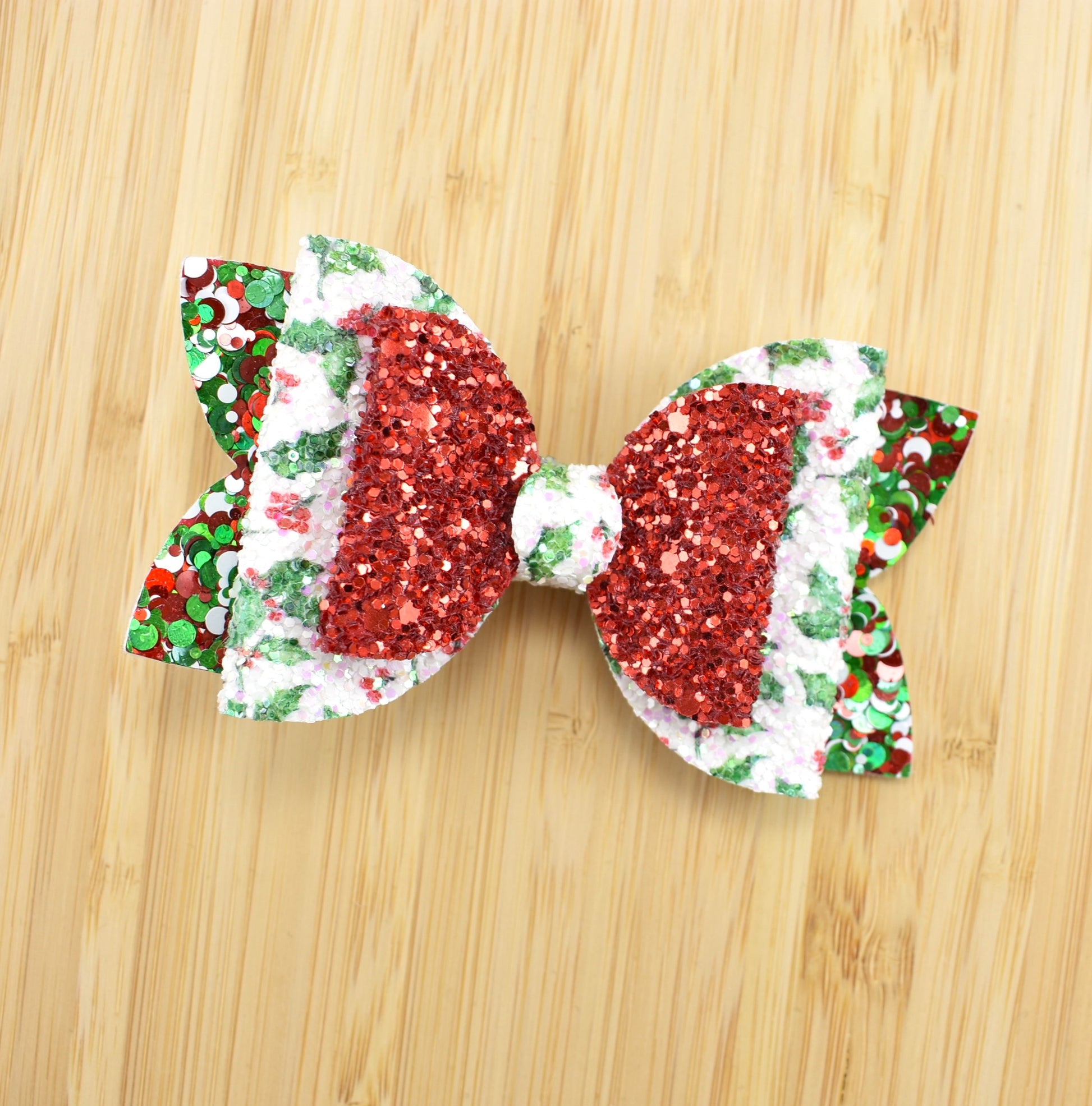 This glittery two layer bow features a glitter Holly print with a red glitter bow on top, and a base made from a festive sequined fabric. The bow is approx. 9cm wide and 5cm high.