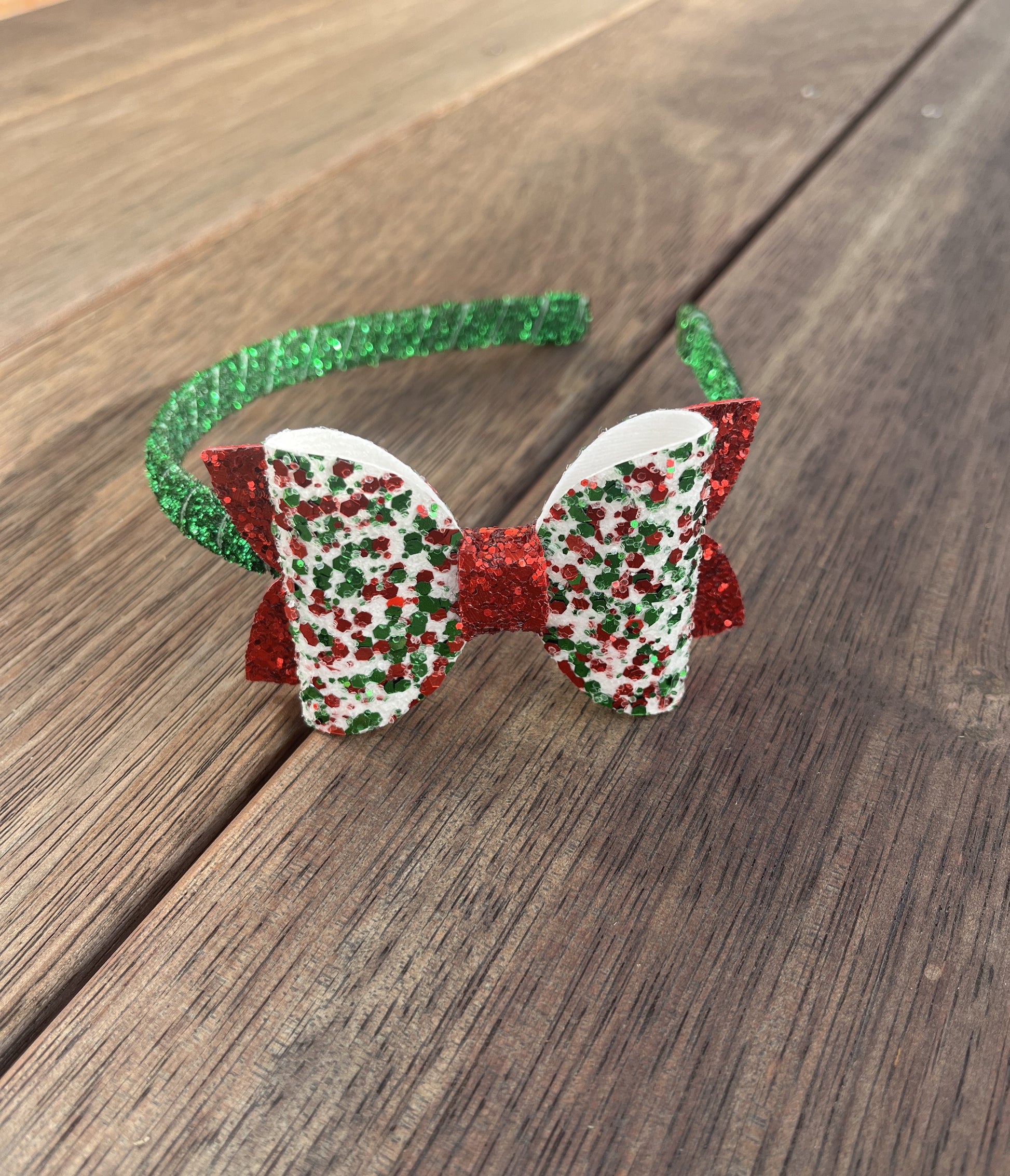 This festive Christmas headband is perfect for Christmas Day, Santa photos and festive parties! Sparkly red, green and white glitter bow, securely attached to a headband wrapped in green glitter ribbon.