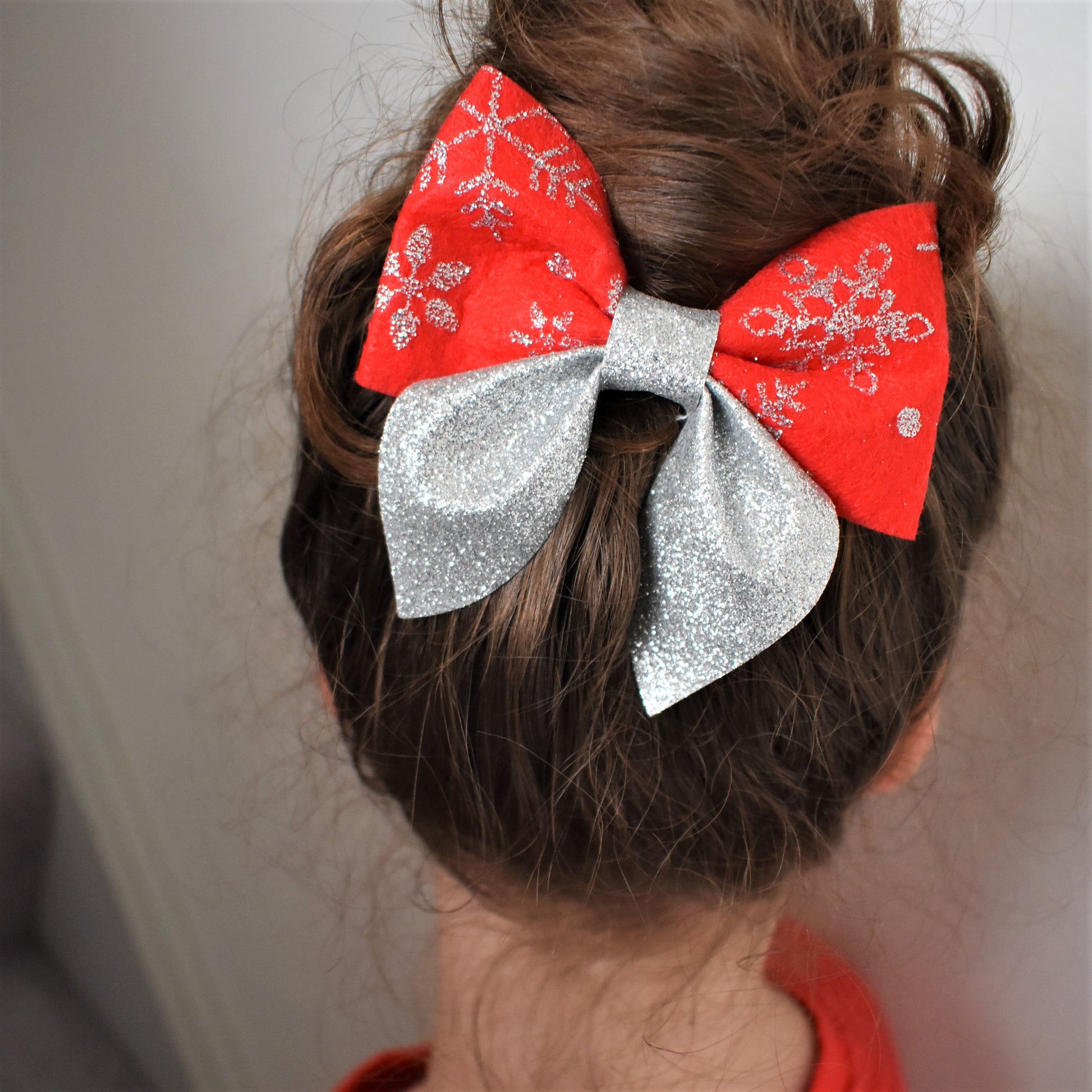 This festive bow is made from a red felt with pretty silver snowflakes printed on it, and has a beautiful silver glitter tail!
