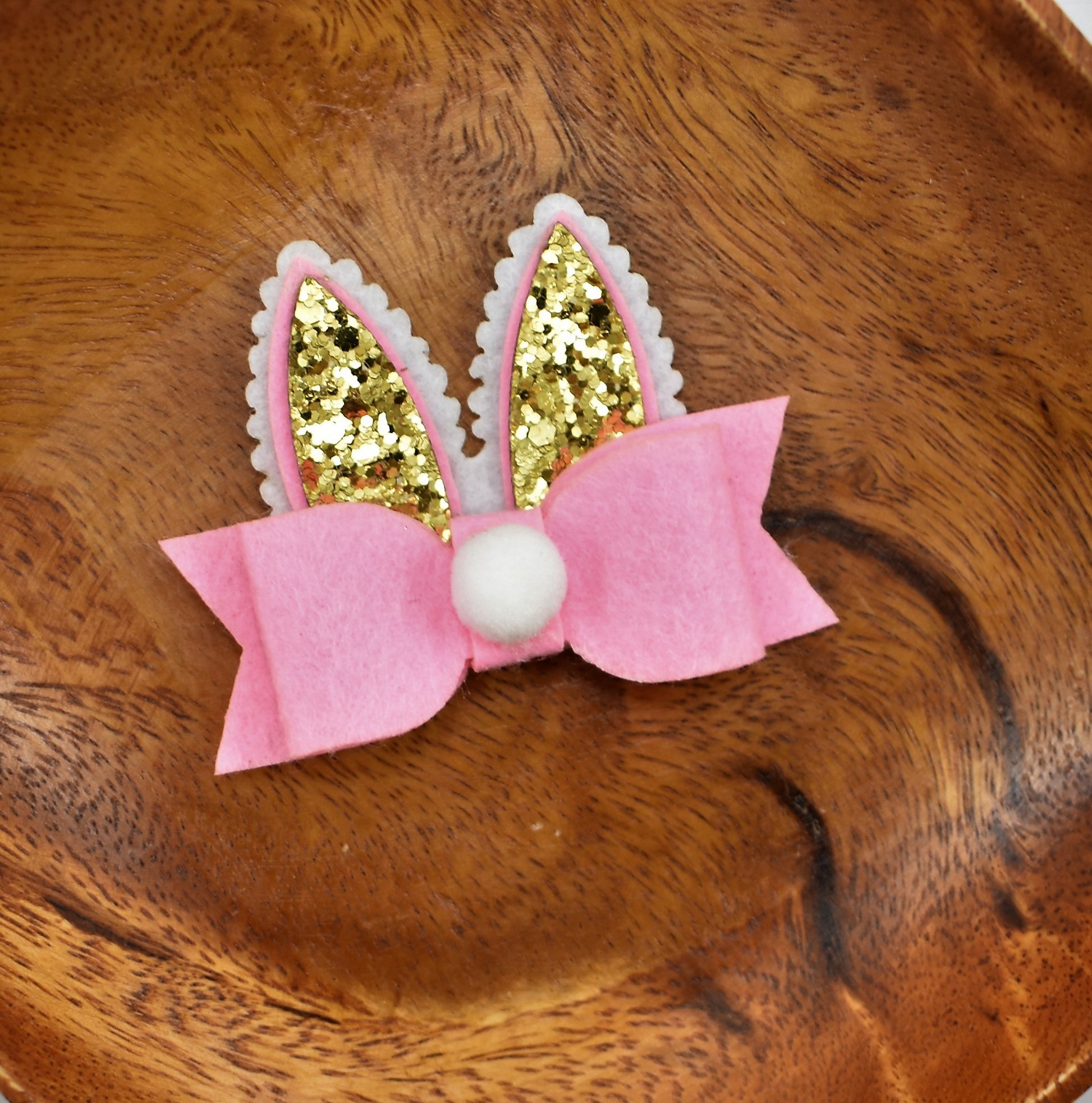 Featuring a pink felt bow with a white pom pom tail, and felt bunny ears with a touch of gold glitter, all securely attached to a 4.5cm alligator clip lined with quality grosgrain ribbon.