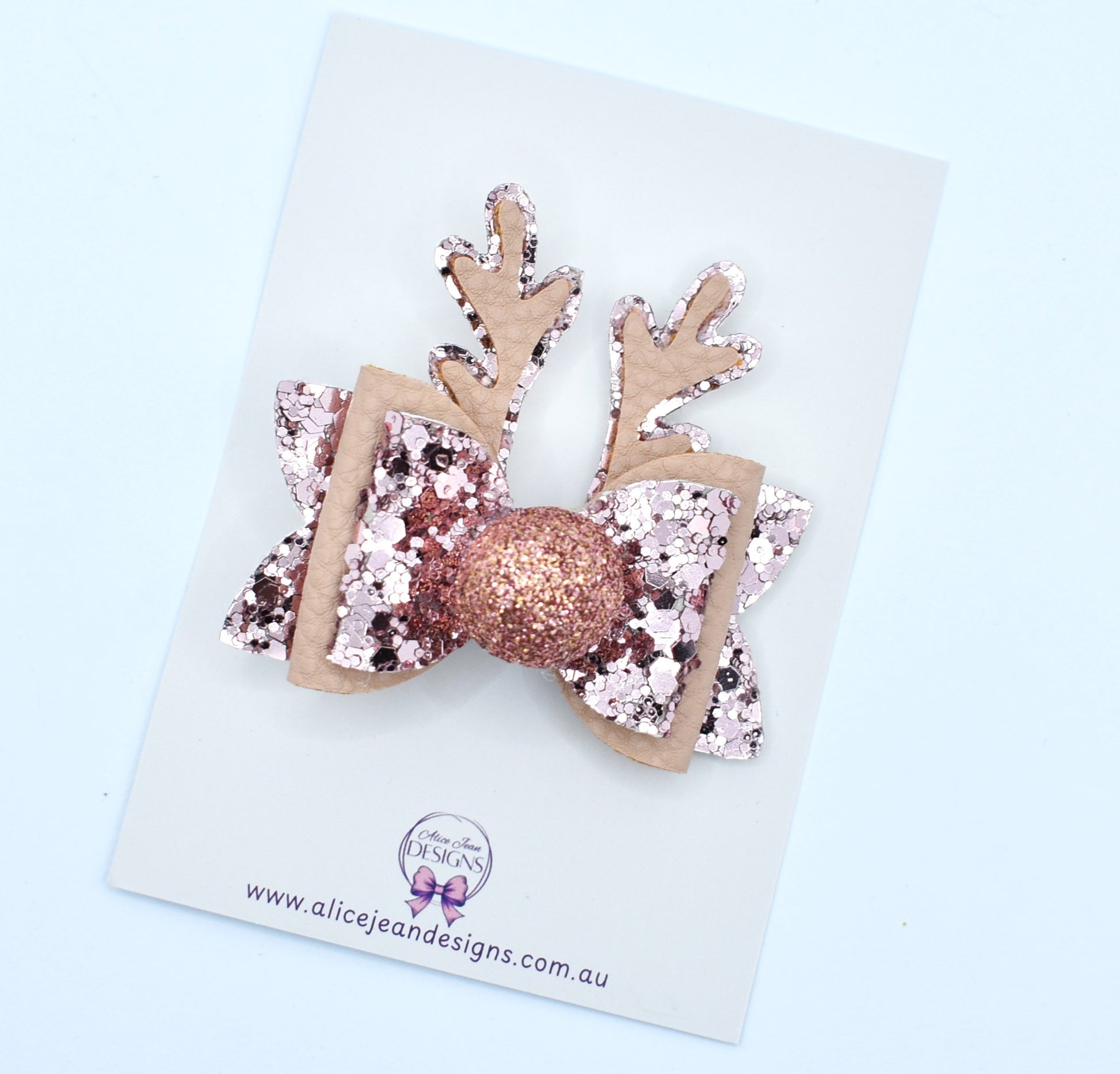 The bow and antlers are made from rose gold glitter and a tan coloured leather. The rose gold nose is a felt glitter ball and is securely attached to the bow with strong glue.